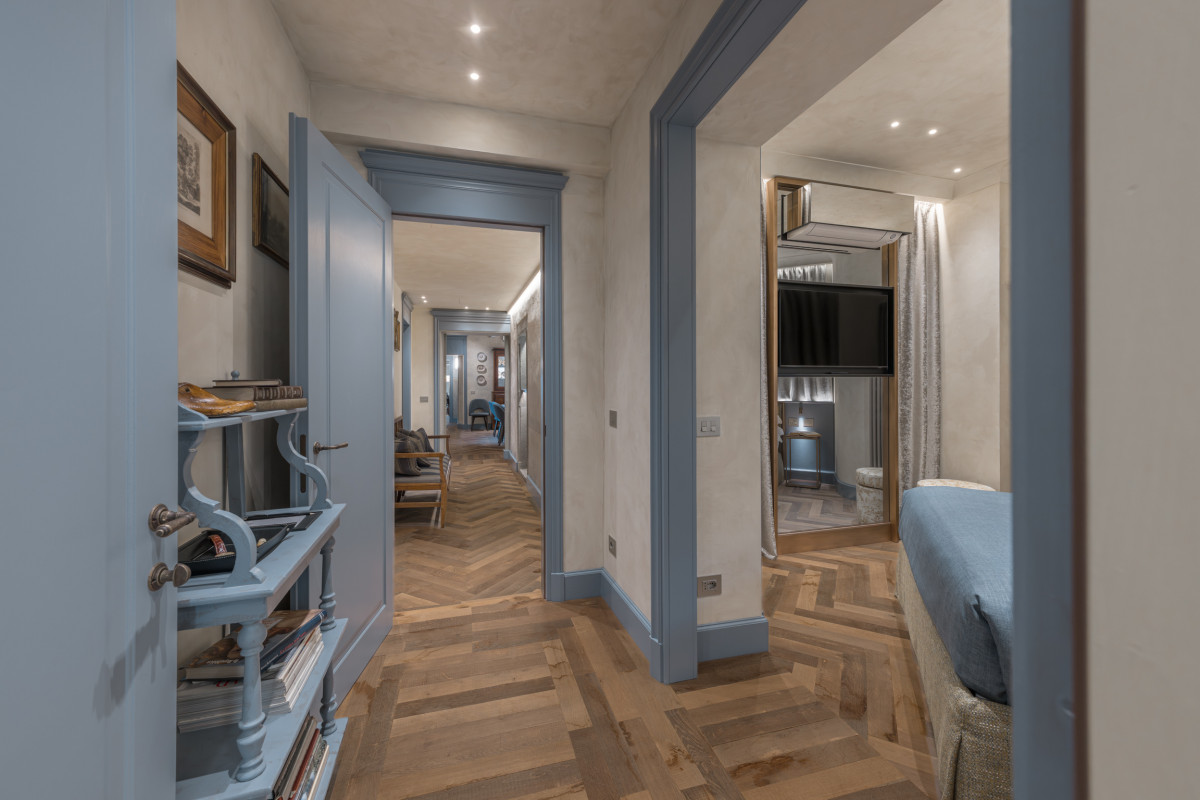 The apartment (300sqm in size), located on the second floor (with elevator), comfortably accommodates 10 guests in five elegant double suites, with the option for two additional guests on trundle beds in two of the bedrooms. Stepping inside feels like traveling back in time, as the residence is adorned with original wall frescoes, antique furnishings from the 18th and 19th centuries, and luxurious fabrics. Each of the five opulent bathrooms is a masterpiece of Italian craftsmanship, featuring distinctive marble and premium fittings for ultimate comfort. Nonetheless the apartment will have a modern vibe and contemporary feel.