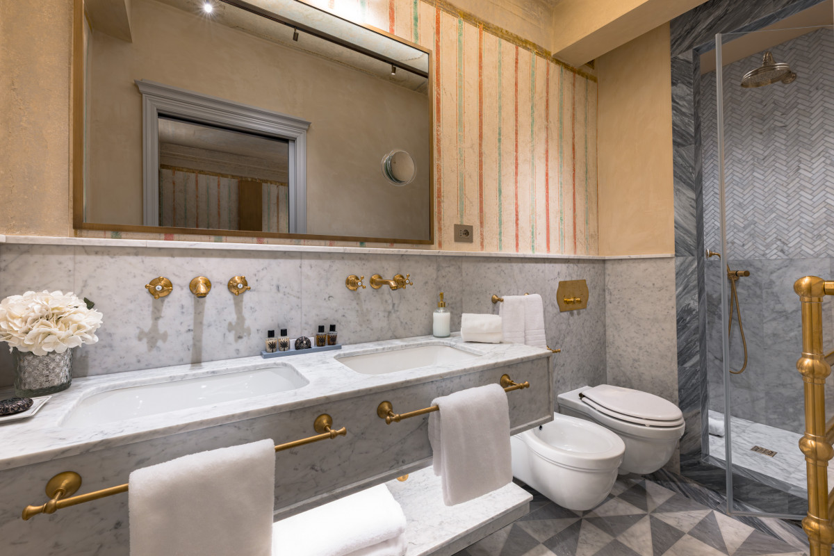 The bedrooms, all featuring bespoke furnishings, reflect the colors of the wall decorations, with luxurious bronze and brass details. Minimalist designer lighting creates an atmosphere of great charm without interfering with the apartment’s significant historical character. The bathrooms, elegantly crafted entirely in marble, showcase shades of white and gray, adorned with traditional Florentine-inspired decorations while incorporating subtle modern touches. A refined and understated luxury with timeless charm.